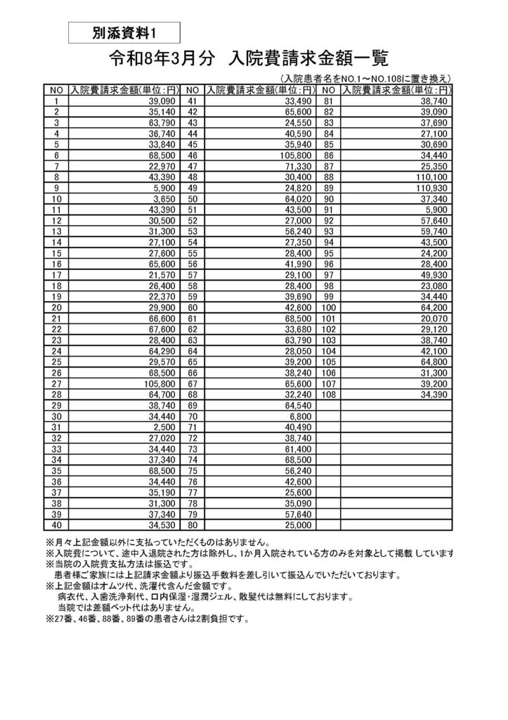 備北ななつか病院に現在入院されている患者様にご請求した入院費【2026年3月実績】の一覧表になります。