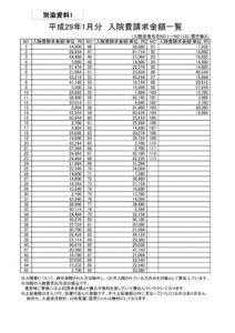 備北ななつか病院に現在入院されている患者様にご請求した入院費【2017年1月実績】の一覧表になります。