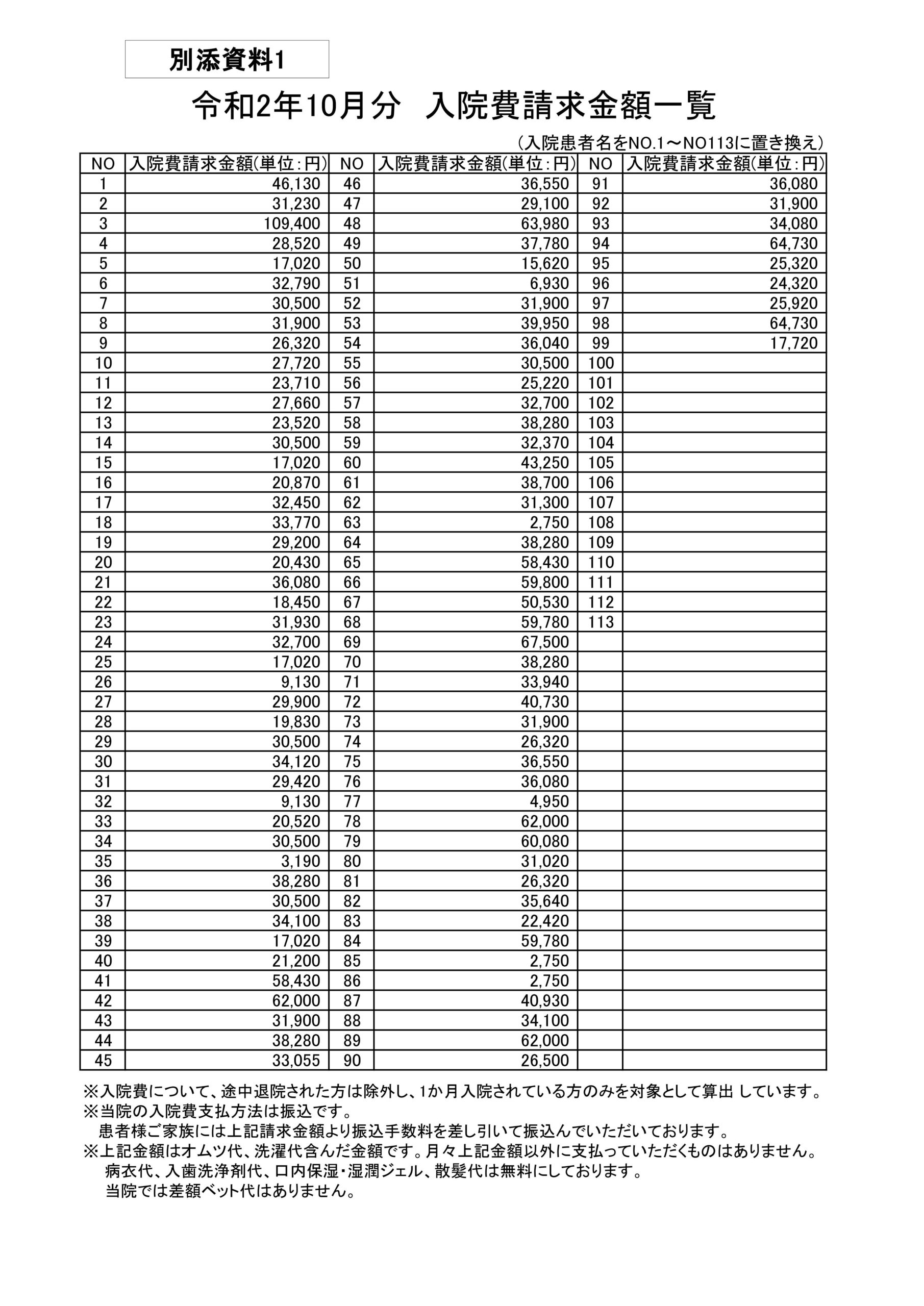 備北ななつか病院に現在入院されている患者様にご請求した入院費【2020年10月実績】の一覧表になります。