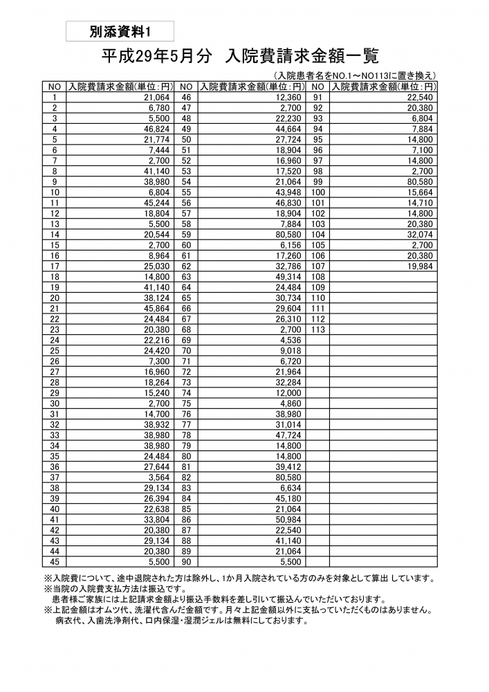 備北ななつか病院に現在入院されている患者様にご請求した入院費【2017年5月実績】の一覧表になります。