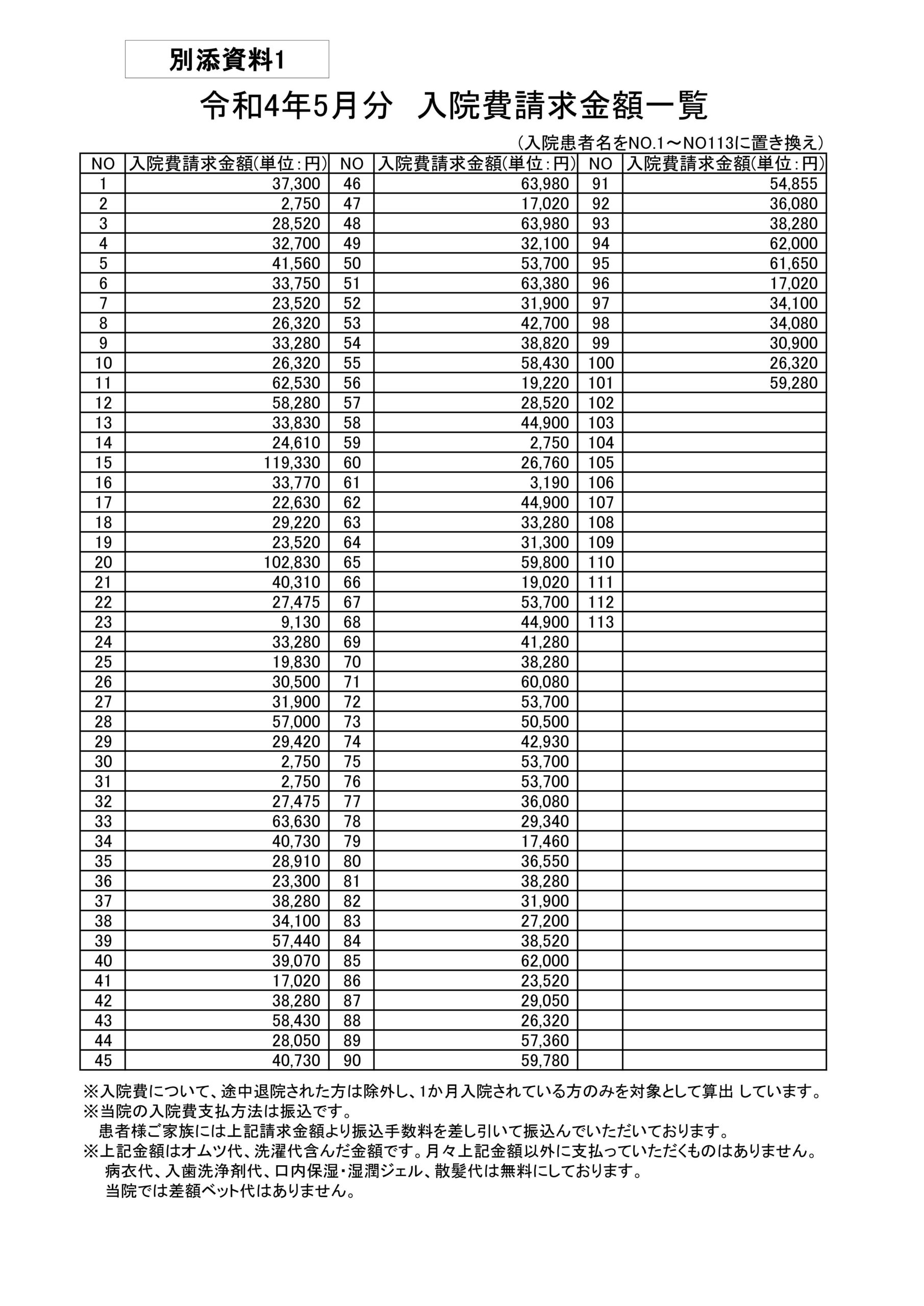 備北ななつか病院に現在入院されている患者様にご請求した入院費【2022年5月実績】の一覧表になります。