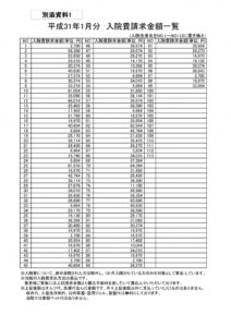 備北ななつか病院に現在入院されている患者様にご請求した入院費【2019年1月実績】の一覧表になります。