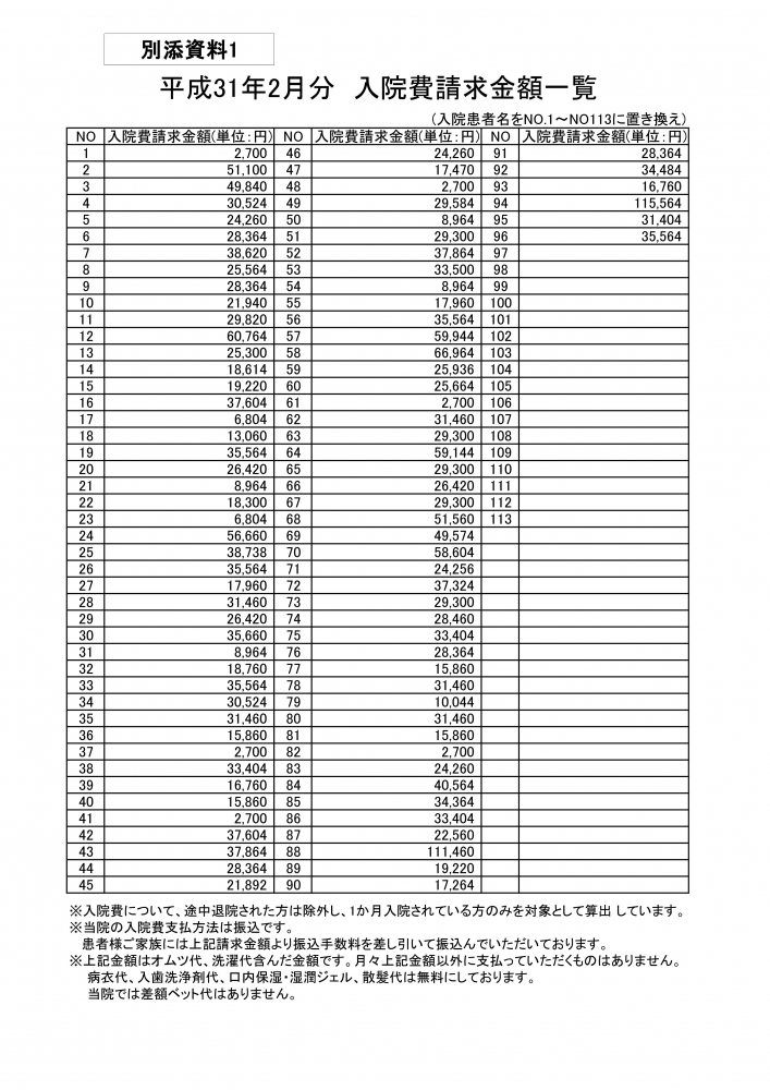 備北ななつか病院に現在入院されている患者様にご請求した入院費【2019年2月実績】の一覧表になります。