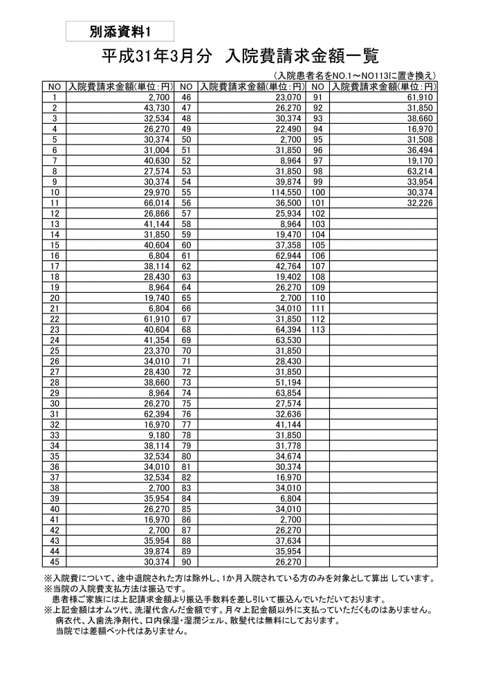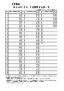 備北ななつか病院に現在入院されている患者様にご請求した入院費【2019年3月実績】の一覧表になります。
