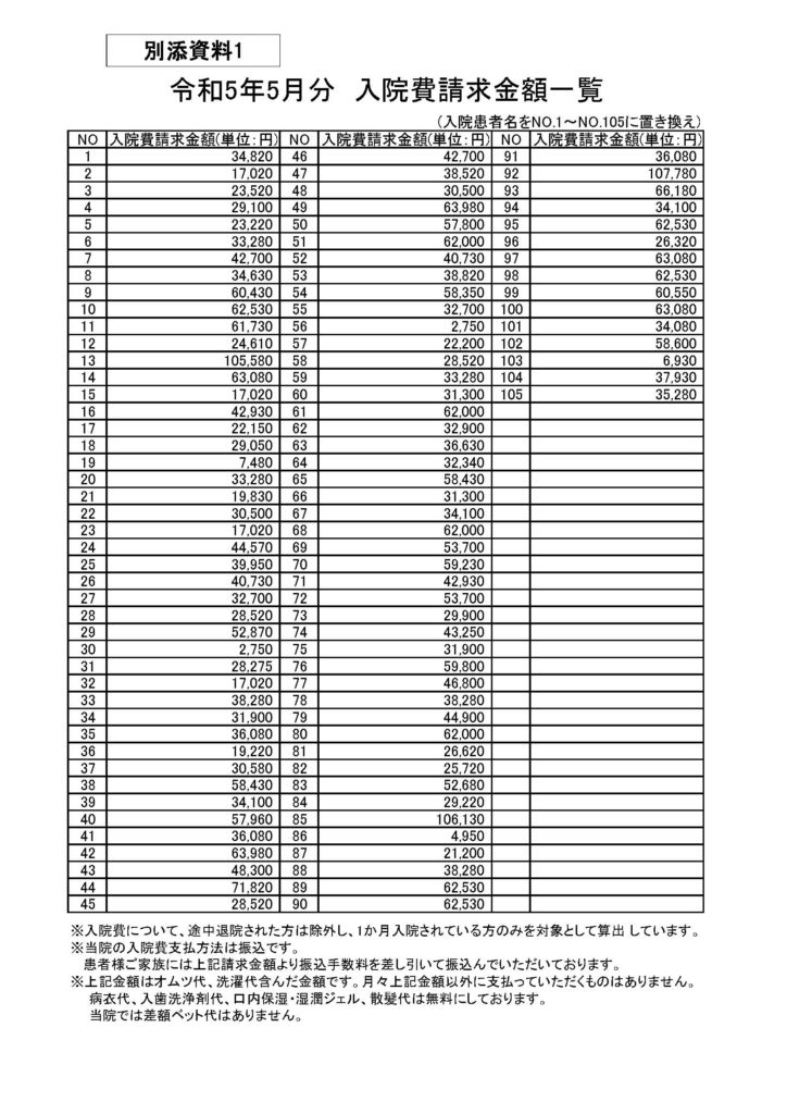 備北ななつか病院に現在入院されている患者様にご請求した入院費【2023年5月実績】の一覧表になります。