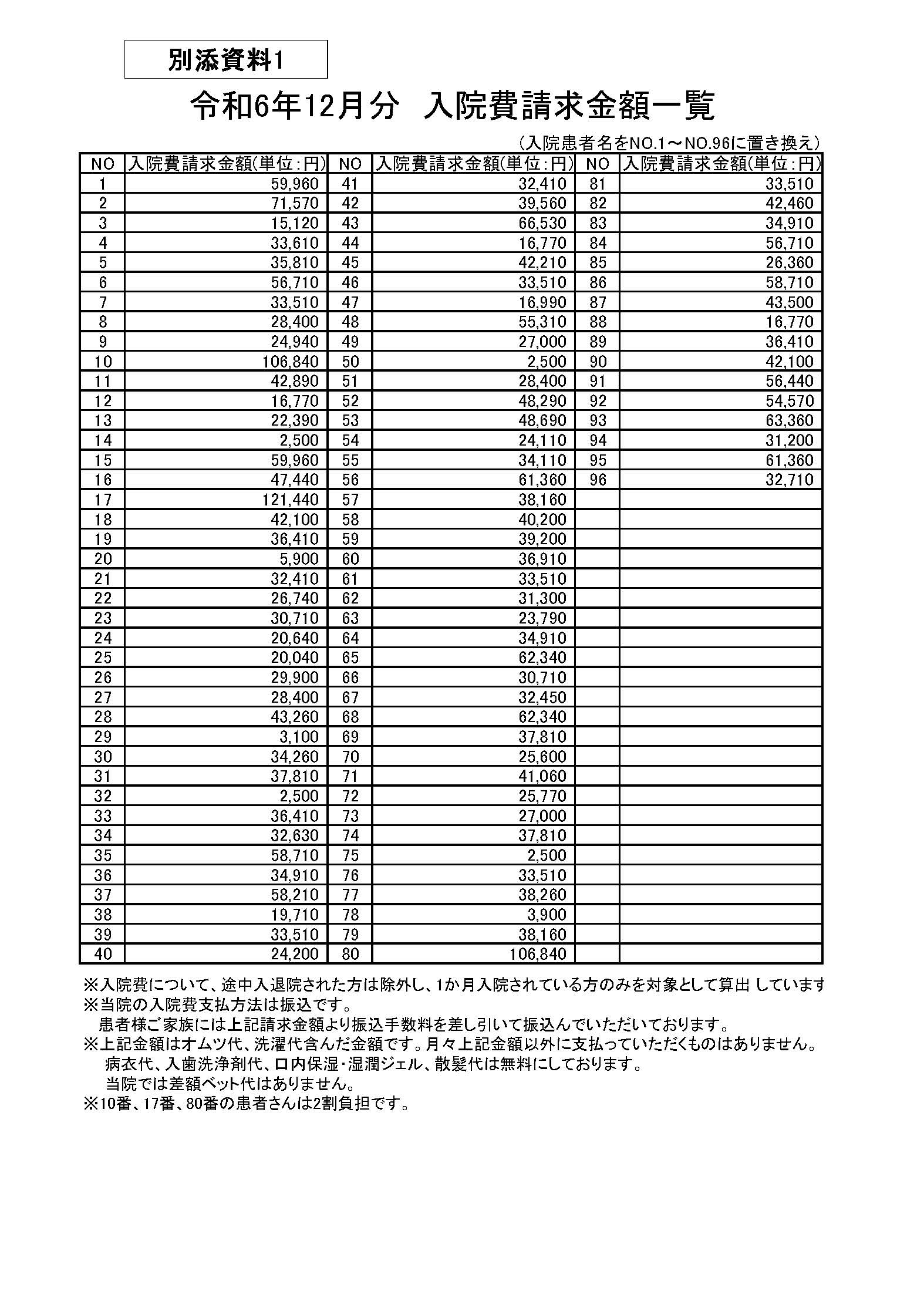 備北ななつか病院に現在入院されている患者様にご請求した入院費【2024年12月実績】の一覧表になります。