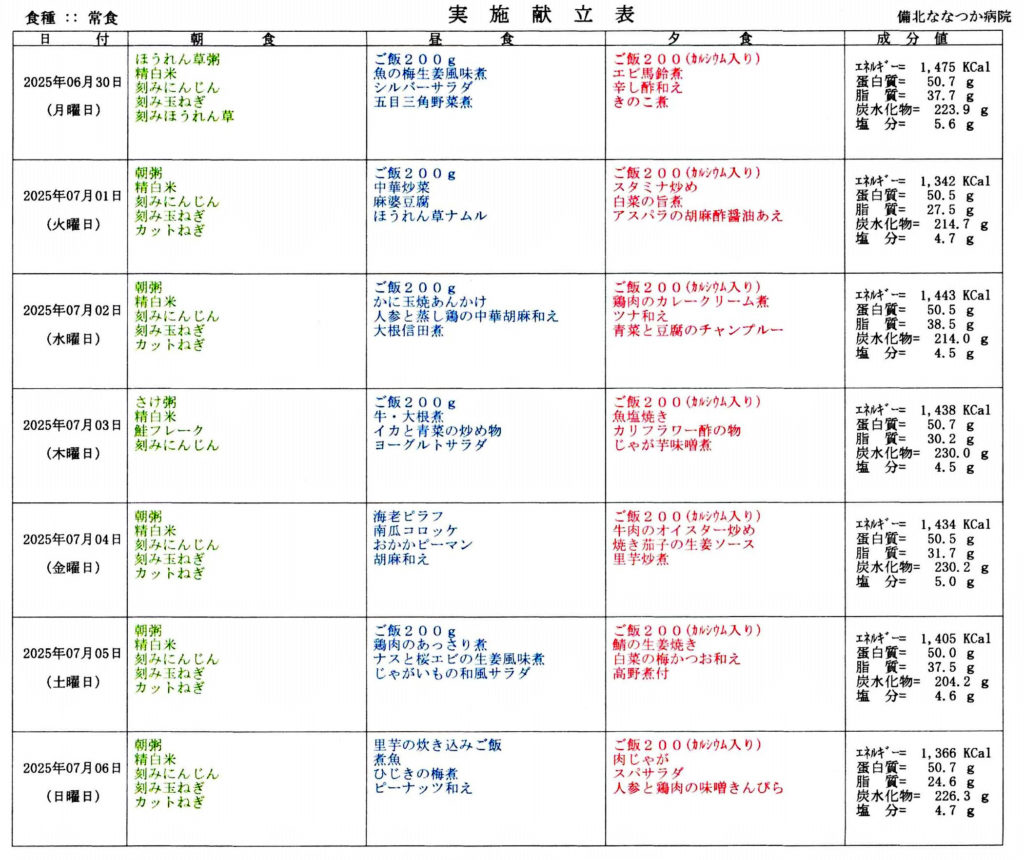 献立表(2025年6月30日~) 2025年6月30日~、1週間の食事メニューになります。 【献立表をクリックすれば鮮明な画像になります。】 お知らせ 2025年6月27日 投稿ナビゲーション ← 前の記事へ 次の記事へ → ブログ一覧へ戻る カテゴリー お知らせ (173) ご家族の声 (1) 入院自己負担金の実績 (109) 毎週の食事メニュー (35) 病院取材実績 (12) 1週間の献立 (4) 最近の投稿 献立表(2026年1月26日~2026年2月8日) 献立表(2026年1月12日~2026年1月25日) 令和7年12月分 入院自己負担金のお知らせ 本日の地震の影響はありません。 献立表(2025年12月29日~2026年1月11日) アーカイブ アーカイブ 月を選択 2026年1月 (4) 2025年12月 (4) 2025年11月 (4) 2025年10月 (6) 2025年9月 (5) 2025年8月 (6) 2025年7月 (5) 2025年6月 (5) 2025年5月 (6) 2025年4月 (6) 2025年3月 (7) 2025年2月 (4) 2025年1月 (1) 2024年12月 (2) 2024年11月 (2) 2024年10月 (3) 2024年9月 (1) 2024年8月 (1) 2024年7月 (6) 2024年6月 (2) 2024年5月 (3) 2024年4月 (4) 2024年3月 (2) 2024年2月 (3) 2024年1月 (1) 2023年12月 (1) 2023年11月 (2) 2023年10月 (7) 2023年9月 (1) 2023年8月 (2) 2023年7月 (1) 2023年6月 (1) 2023年5月 (3) 2023年4月 (2) 2023年3月 (1) 2023年2月 (1) 2023年1月 (2) 2022年12月 (2) 2022年11月 (2) 2022年10月 (3) 2022年9月 (1) 2022年8月 (1) 2022年7月 (2) 2022年6月 (1) 2022年5月 (3) 2022年4月 (1) 2022年3月 (1) 2022年2月 (1) 2022年1月 (6) 2021年12月 (3) 2021年11月 (1) 2021年10月 (2) 2021年9月 (1) 2021年8月 (5) 2021年7月 (3) 2021年6月 (3) 2021年5月 (3) 2021年4月 (4) 2021年3月 (1) 2021年2月 (1) 2021年1月 (1) 2020年12月 (2) 2020年11月 (1) 2020年10月 (1) 2020年9月 (1) 2020年8月 (1) 2020年7月 (2) 2020年6月 (1) 2020年5月 (2) 2020年4月 (3) 2020年3月 (2) 2020年2月 (2) 2020年1月 (1) 2019年12月 (1) 2019年11月 (4) 2019年10月 (3) 2019年9月 (2) 2019年8月 (3) 2019年7月 (2) 2019年6月 (1) 2019年5月 (1) 2019年4月 (1) 2019年3月 (1) 2019年2月 (1) 2019年1月 (3) 2018年12月 (2) 2018年11月 (2) 2018年10月 (3) 2018年9月 (3) 2018年8月 (3) 2018年7月 (5) 2018年6月 (4) 2018年5月 (1) 2018年4月 (1) 2018年3月 (3) 2018年2月 (3) 2018年1月 (1) 2017年12月 (3) 2017年11月 (1) 2017年10月 (3) 2017年9月 (1) 2017年8月 (3) 2017年7月 (6) 2017年6月 (4) 2017年5月 (2) 2017年4月 (3) 2017年3月 (5) 2017年2月 (2) 2017年1月 (1) 2016年12月 (2) 2016年11月 (3) 2016年10月 (2) 2016年9月 (3) 2016年8月 (2) ブログ内検索 検索: