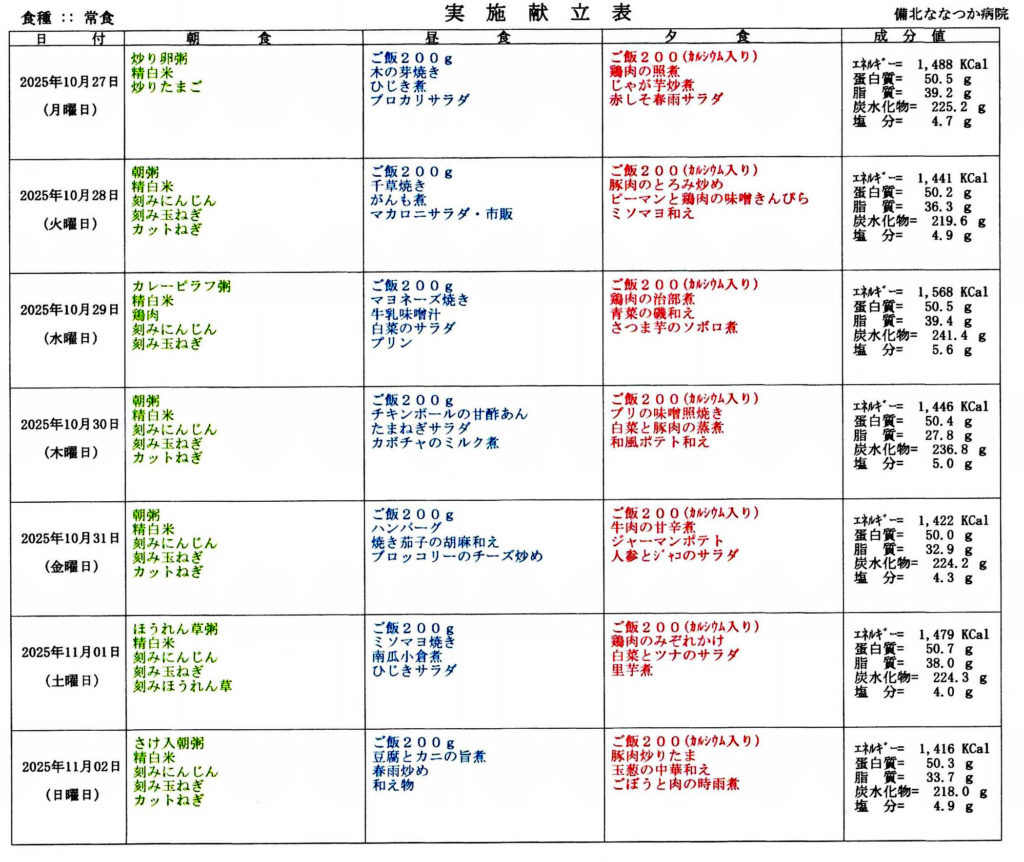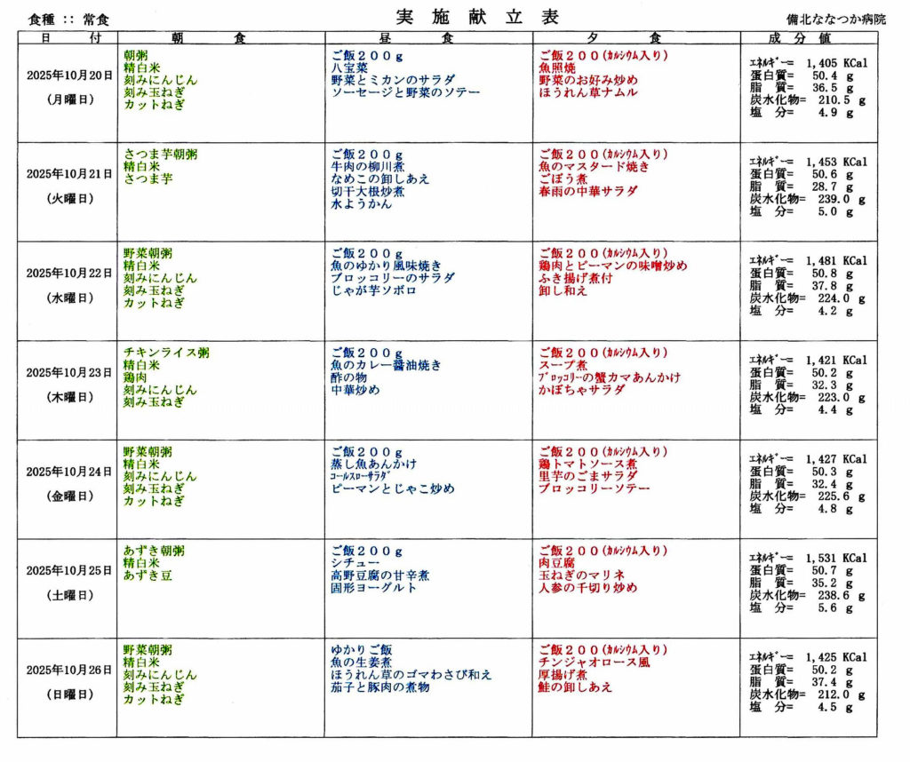 ブログ一覧へ戻る2025年10月20日~11月2日、2週間の食事メニューになります。