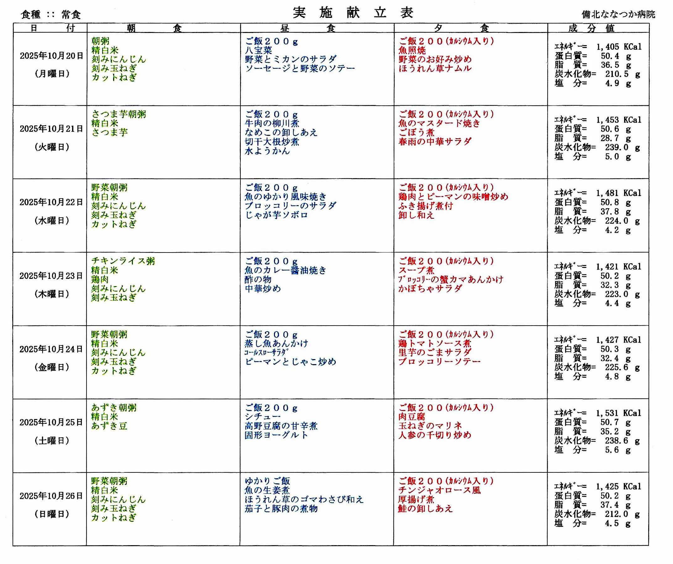 ブログ一覧へ戻る2025年10月20日~11月2日、2週間の食事メニューになります。