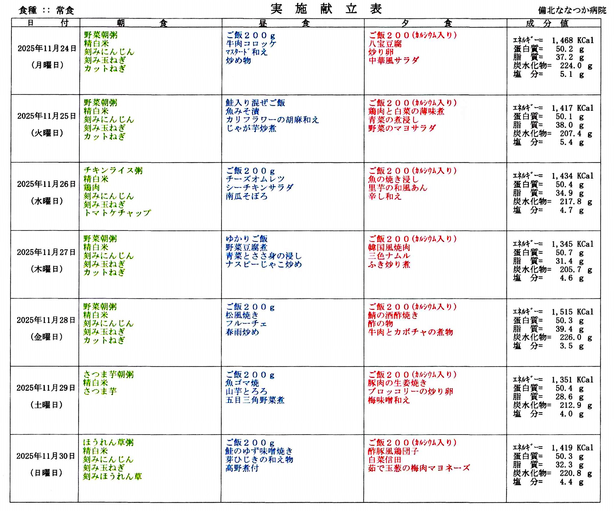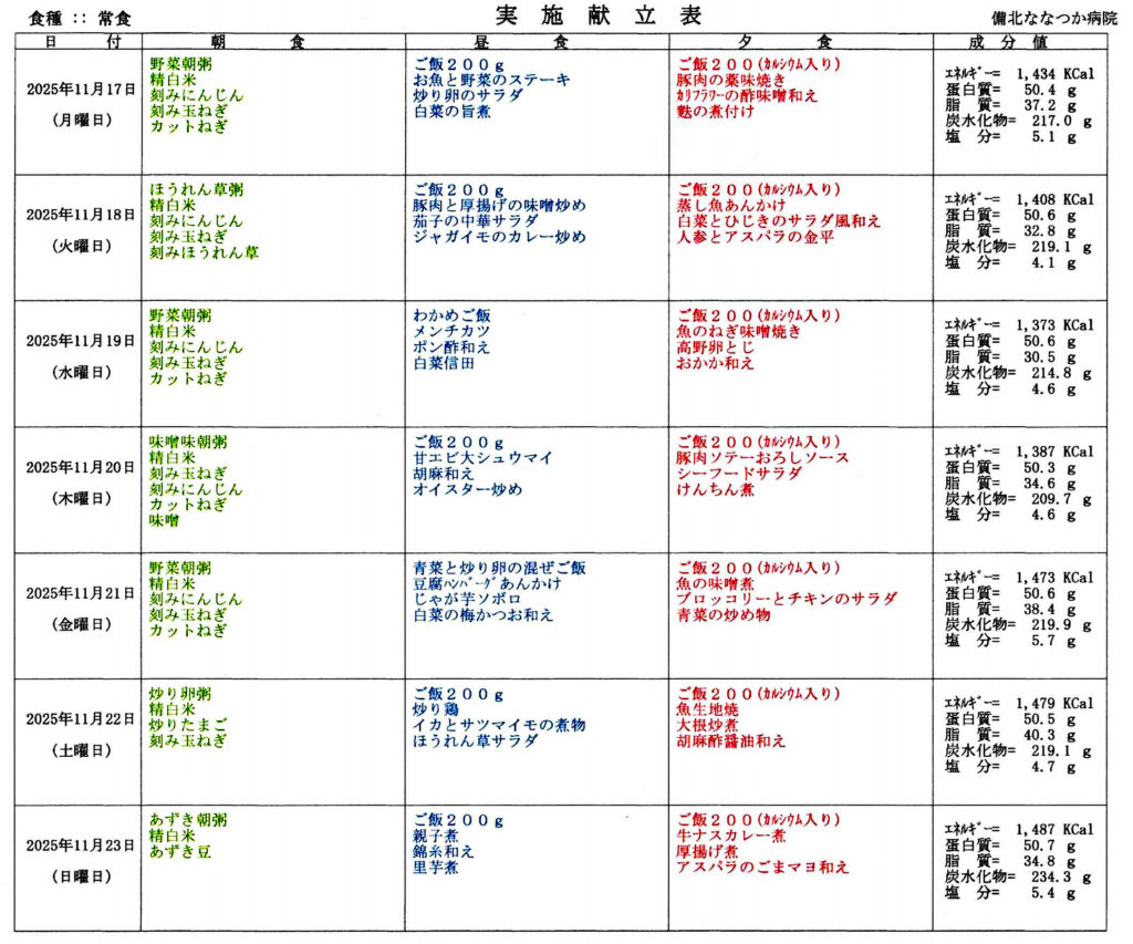 ブログ一覧へ戻る2025年11月17日~11月30日、2週間の食事メニューになります。