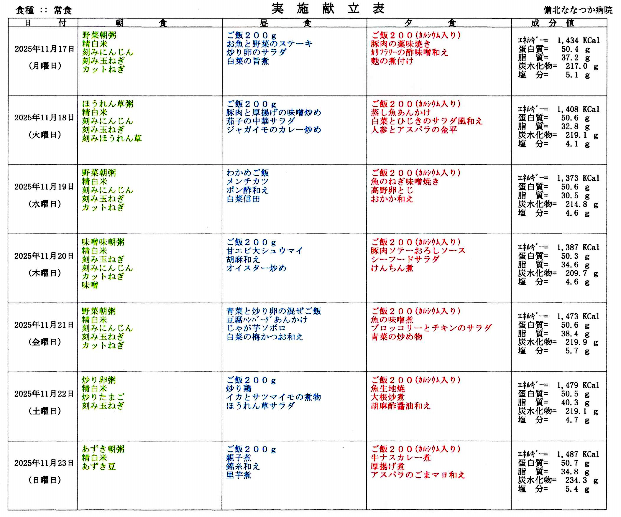 2025年11月17日~11月30日、2週間の食事メニューになります。