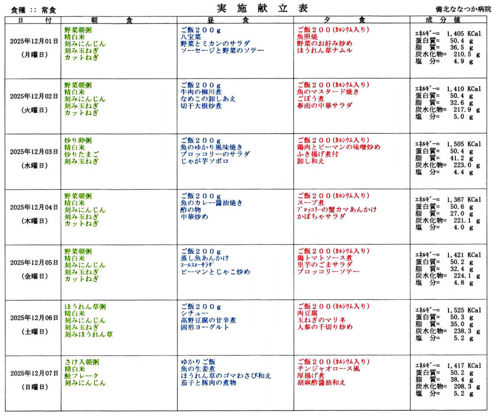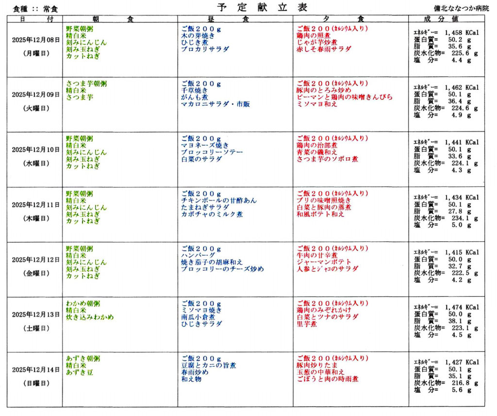 ブログ一覧へ戻る2025年12月1日~12月14日、2週間の食事メニューになります。