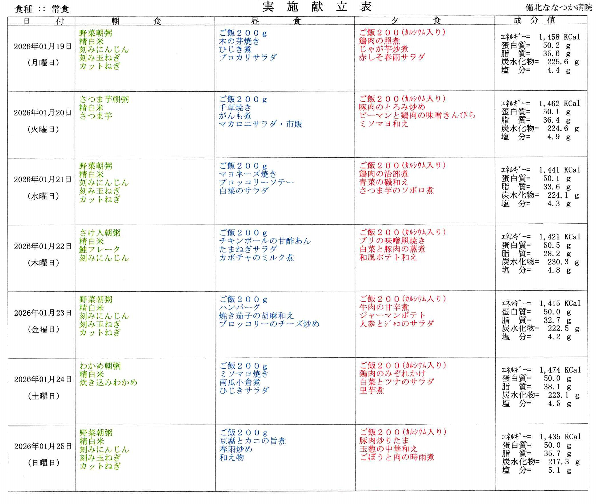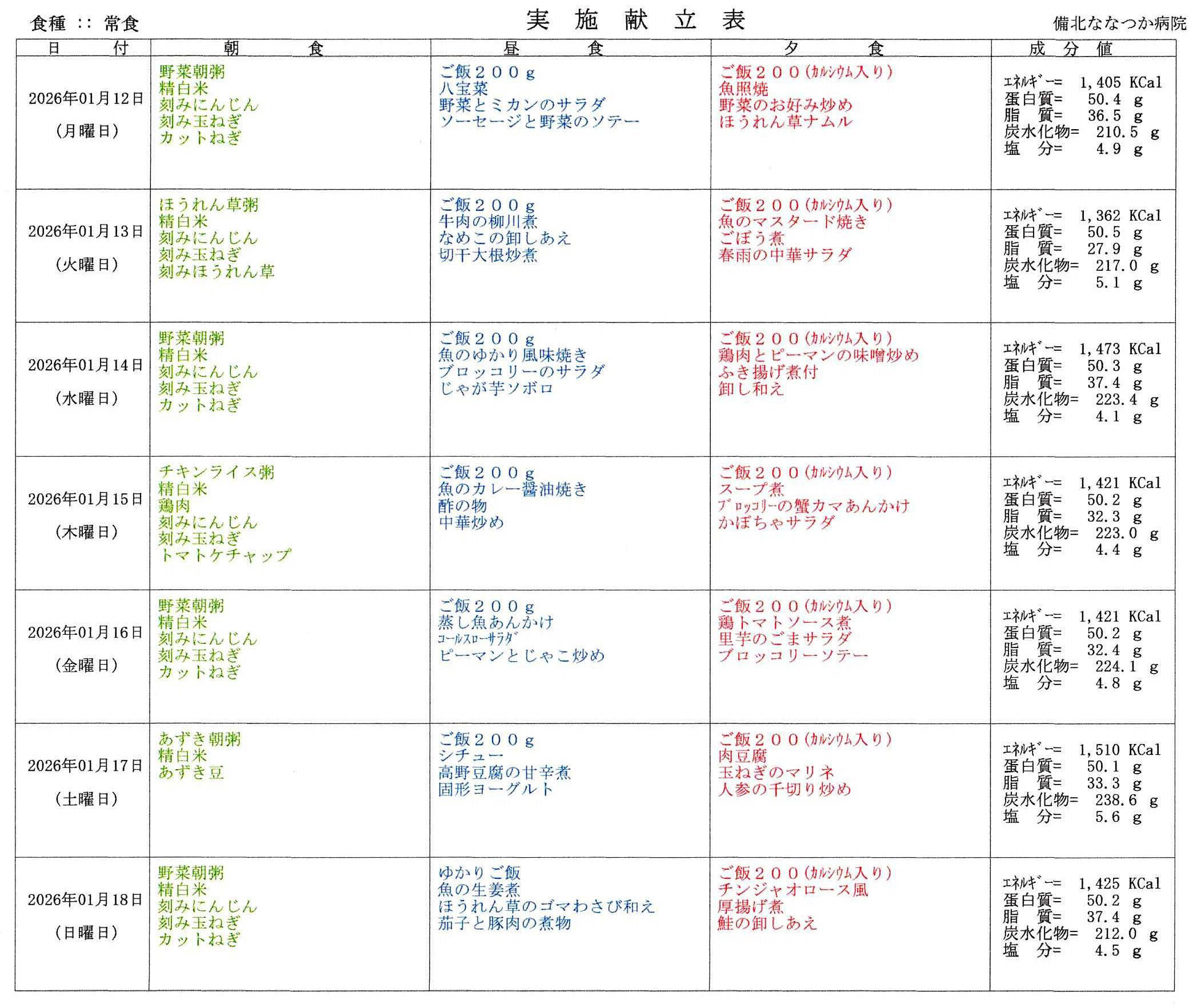 2026年1月12日~2026年1月25日、2週間の食事メニューになります。