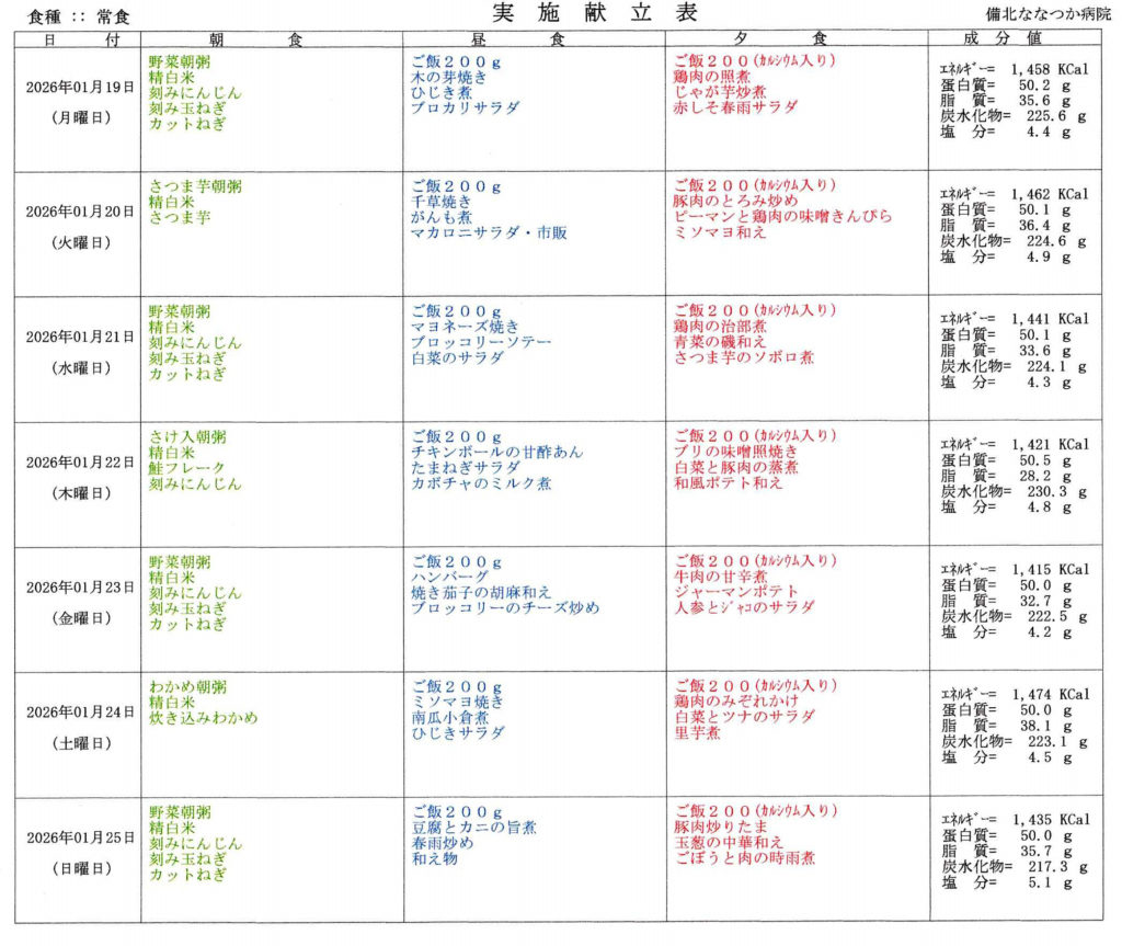 ブログ一覧へ戻る2026年1月12日~2026年1月25日、2週間の食事メニューになります。