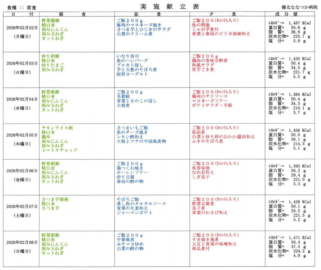 2026年1月26日~2026年2月8日、2週間の食事メニューになります。