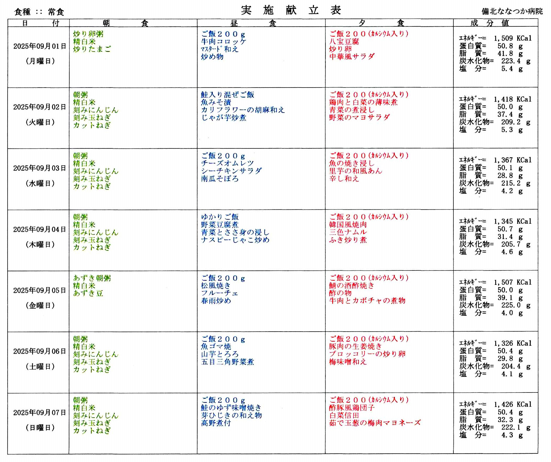 献立表(2025年9月1日~) 2025年9月1日~、1週間の食事メニューになります。 【献立表をクリックすれば鮮明な画像になります。】 毎週の食事メニュー 2025年8月29日 投稿ナビゲーション ← 前の記事へ 次の記事へ → ブログ一覧へ戻る カテゴリー お知らせ (173) ご家族の声 (1) 入院自己負担金の実績 (109) 毎週の食事メニュー (35) 病院取材実績 (12) 1週間の献立 (4) 最近の投稿 献立表(2026年1月26日~2026年2月8日) 献立表(2026年1月12日~2026年1月25日) 令和7年12月分 入院自己負担金のお知らせ 本日の地震の影響はありません。 献立表(2025年12月29日~2026年1月11日) アーカイブ アーカイブ 月を選択 2026年1月 (4) 2025年12月 (4) 2025年11月 (4) 2025年10月 (6) 2025年9月 (5) 2025年8月 (6) 2025年7月 (5) 2025年6月 (5) 2025年5月 (6) 2025年4月 (6) 2025年3月 (7) 2025年2月 (4) 2025年1月 (1) 2024年12月 (2) 2024年11月 (2) 2024年10月 (3) 2024年9月 (1) 2024年8月 (1) 2024年7月 (6) 2024年6月 (2) 2024年5月 (3) 2024年4月 (4) 2024年3月 (2) 2024年2月 (3) 2024年1月 (1) 2023年12月 (1) 2023年11月 (2) 2023年10月 (7) 2023年9月 (1) 2023年8月 (2) 2023年7月 (1) 2023年6月 (1) 2023年5月 (3) 2023年4月 (2) 2023年3月 (1) 2023年2月 (1) 2023年1月 (2) 2022年12月 (2) 2022年11月 (2) 2022年10月 (3) 2022年9月 (1) 2022年8月 (1) 2022年7月 (2) 2022年6月 (1) 2022年5月 (3) 2022年4月 (1) 2022年3月 (1) 2022年2月 (1) 2022年1月 (6) 2021年12月 (3) 2021年11月 (1) 2021年10月 (2) 2021年9月 (1) 2021年8月 (5) 2021年7月 (3) 2021年6月 (3) 2021年5月 (3) 2021年4月 (4) 2021年3月 (1) 2021年2月 (1) 2021年1月 (1) 2020年12月 (2) 2020年11月 (1) 2020年10月 (1) 2020年9月 (1) 2020年8月 (1) 2020年7月 (2) 2020年6月 (1) 2020年5月 (2) 2020年4月 (3) 2020年3月 (2) 2020年2月 (2) 2020年1月 (1) 2019年12月 (1) 2019年11月 (4) 2019年10月 (3) 2019年9月 (2) 2019年8月 (3) 2019年7月 (2) 2019年6月 (1) 2019年5月 (1) 2019年4月 (1) 2019年3月 (1) 2019年2月 (1) 2019年1月 (3) 2018年12月 (2) 2018年11月 (2) 2018年10月 (3) 2018年9月 (3) 2018年8月 (3) 2018年7月 (5) 2018年6月 (4) 2018年5月 (1) 2018年4月 (1) 2018年3月 (3) 2018年2月 (3) 2018年1月 (1) 2017年12月 (3) 2017年11月 (1) 2017年10月 (3) 2017年9月 (1) 2017年8月 (3) 2017年7月 (6) 2017年6月 (4) 2017年5月 (2) 2017年4月 (3) 2017年3月 (5) 2017年2月 (2) 2017年1月 (1) 2016年12月 (2) 2016年11月 (3) 2016年10月 (2) 2016年9月 (3) 2016年8月 (2) ブログ内検索 検索: